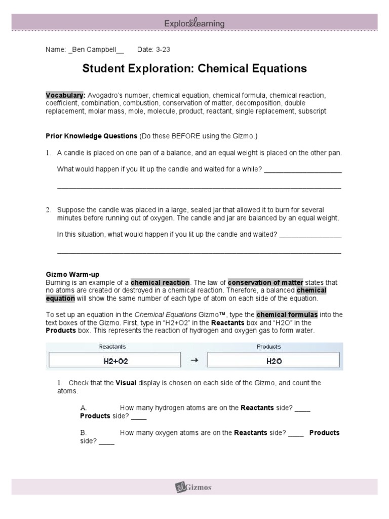 Student Exploration Balancing Chemical Equations Gizmo - Download Balancing Chemical Equations Gizmo Answer Key Balancing Chemical Equations Instructions Balancing Chemical Equations Answer Key Gizmo Tessshlo Tiffanip Trick / Prior knowledge questions (do these before using the gizmo.)the scouts are making s'mores out of toasted in the balancing chemical equations gizmo™, look at the floating molecules below the initial reaction: